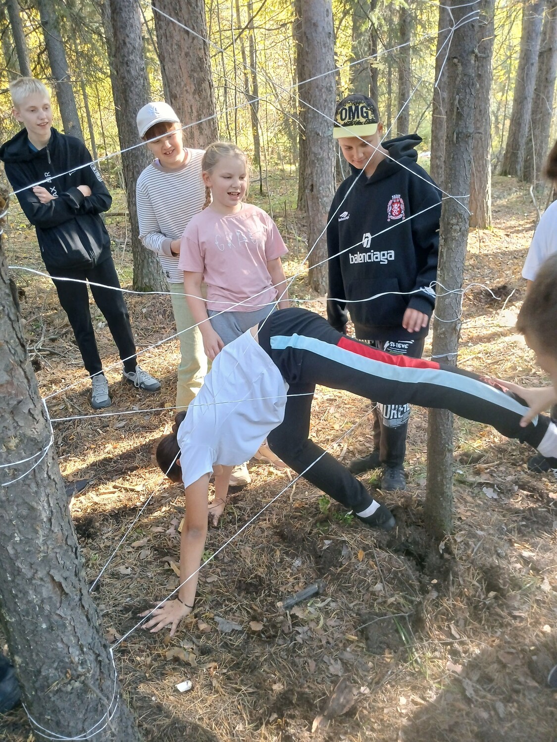 Первым заданием для детей было «попасть в цель». У каждого обучающегося было по 5 шишек, которыми они должны были попасть в обруч и как можно большее количество раз. Вторым заданием обучающиеся должны были пройти «паутинку» стараясь не задеть ее. И третьем заданием было перетягивание каната. Обучающиеся несколько раз делились на команды и старательно участвовали в задании.